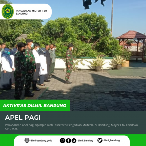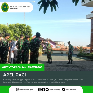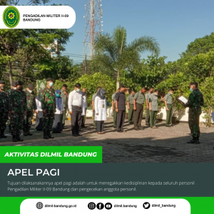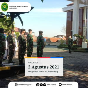 APEL PAGI Posted: August 2, 2021 By: admin Category: Uncategorized Bandung, 2 Agustus 2021 dilaksanakan apel pagi yang dipimpin oleh Sekretaris Pengadilan Militer II-09 Bandung Mayor Chk Handoko, S.H., M.H. dengan menerapkan protokol kesehatan. (Admin) Share No Image PENGANTAR TUGAS KADILMIL, POK HAKIM MILITER DAN SYUKURAN KENAIKAN PANGKAT ANGGOTA DILMIL BANDUNG Jun 10, 2017 Uncategorized No Image PENGANTAR TUGAS KADILMIL, POK HAKIM MILITER DAN SYUKURAN KENAIKAN PANGKAT ANGGOTA DILMIL BANDUNG Jun 10, 2017 Uncategorized No Image RENSTRA MAHKAMAH AGUNG RI 2015-2019 Jun 10, 2017 Uncategorized No Image 10 INOVASI UNGGULAN KOMPETISI PELAYANAN PUBLIK PERADILAN 2015 Jun 10, 2017 Uncategorized No Image KEPUTUSAN SEKRETARIS MAHKAMAH AGUNG RI NO : 49/SEK/SK/X/2015 tentang TIM HELPDESK LAPORAN KEUANGAN Jun 10, 2017 Uncategorized No Image PENGUMUMAN STRUKTUR ORGANISASI PENGADILAN Jun 10, 2017 Uncategorized