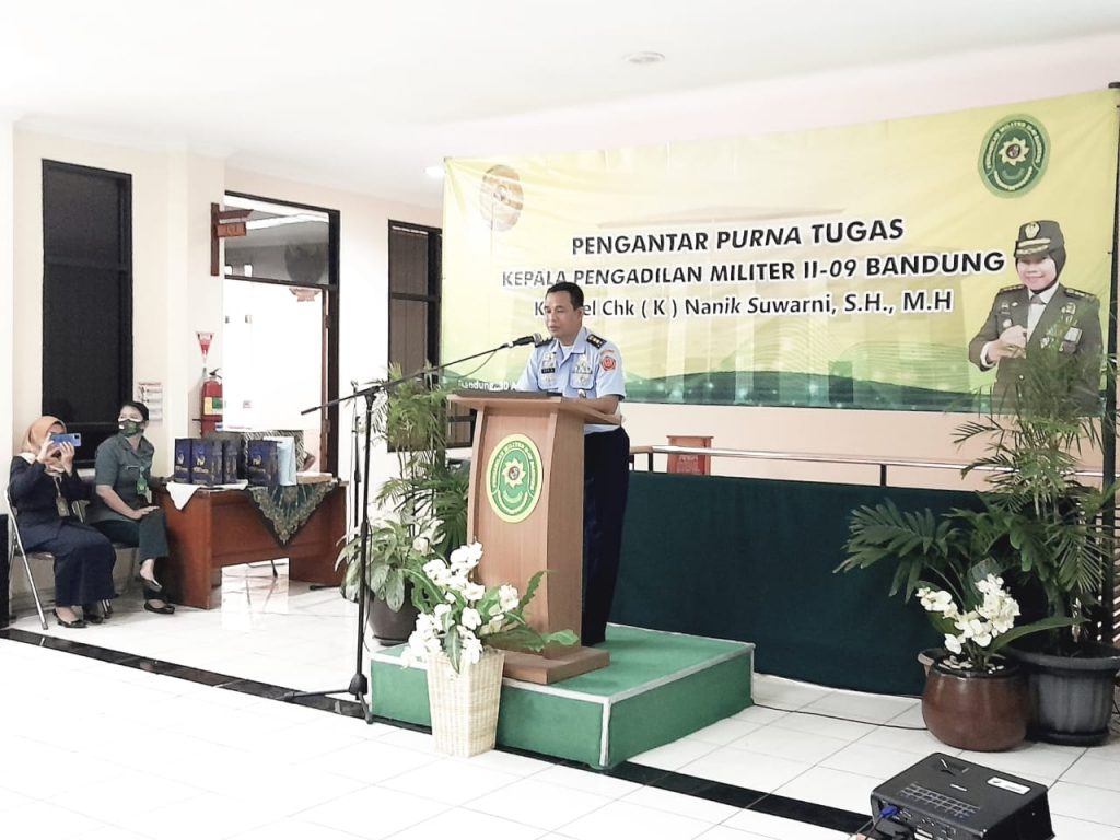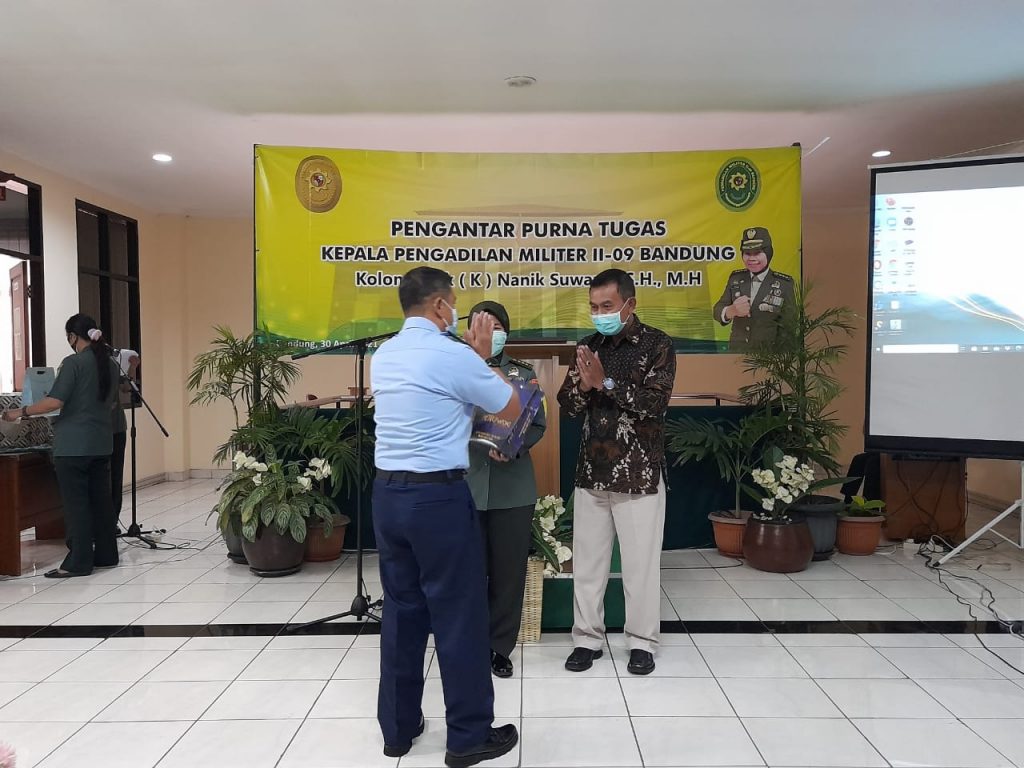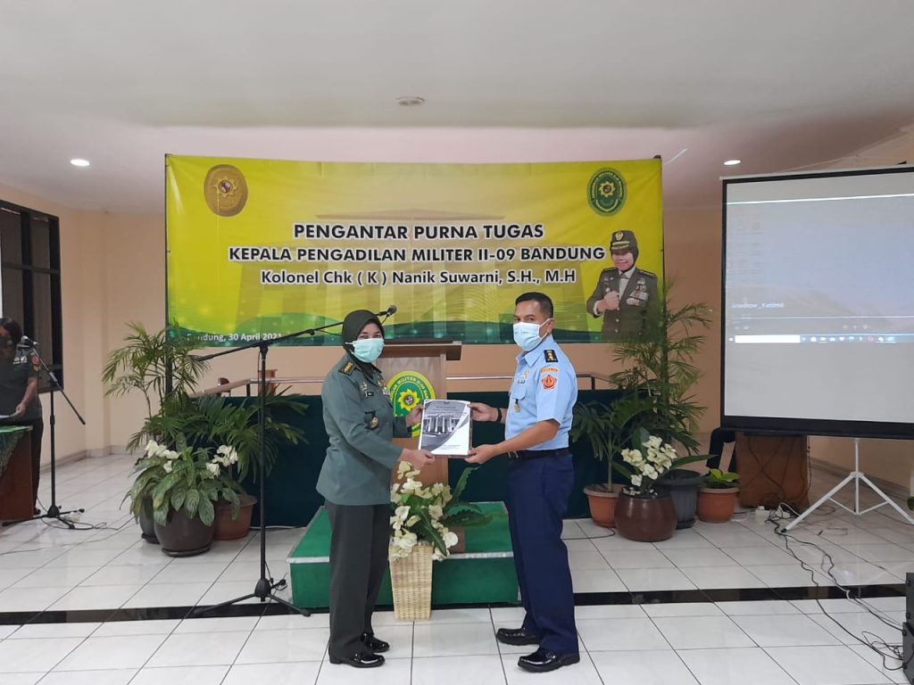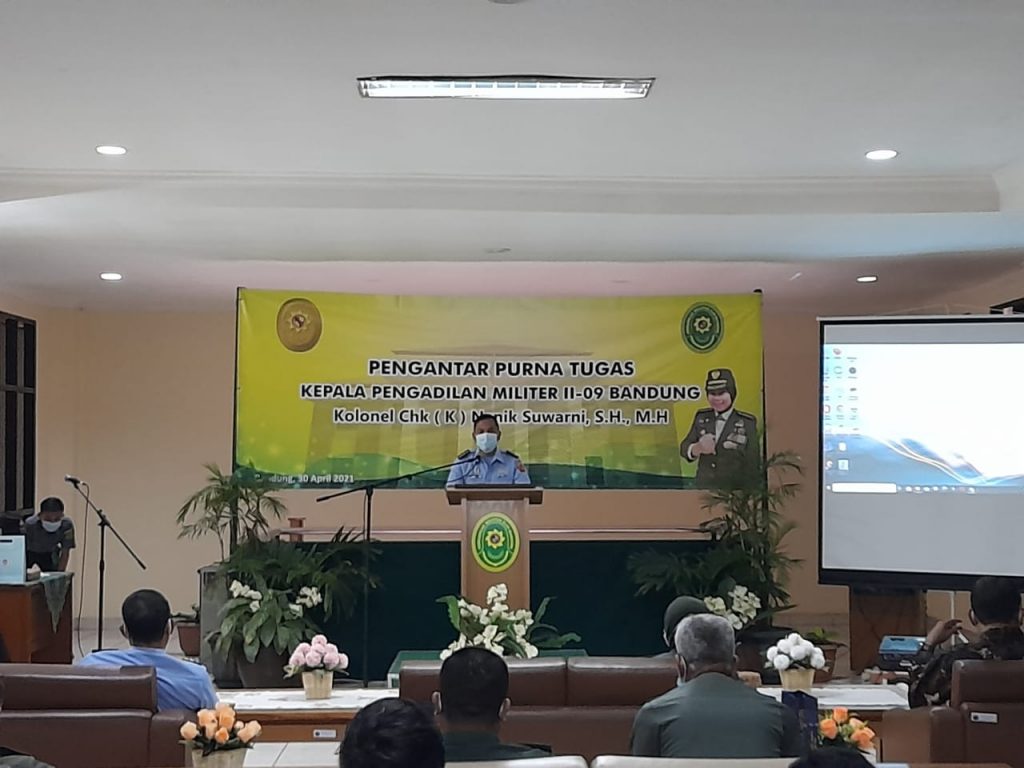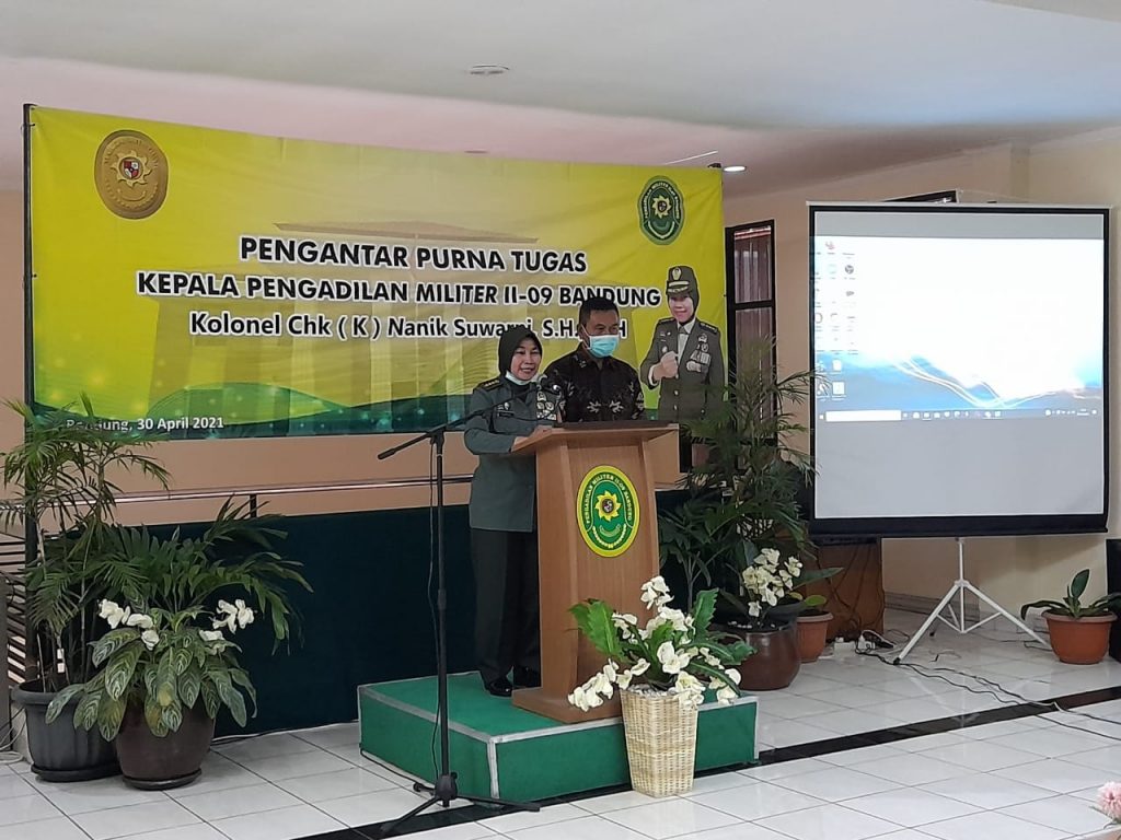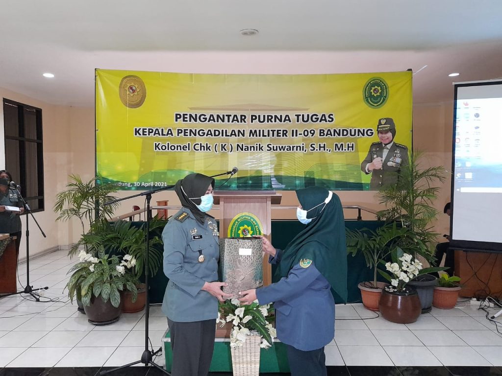 (Bandung) Perjalanan karier Kolonel Chk (K) Nanik Suwarni, S.H., M.H. sejak tahun 2013 sampai dengan tahun 2016 menjadi Anggota Pokkimmil Gol.V di Dilmil II-09 Bandung, selanjutnya pada tanggal 29 Mei 2019 dipromosikan menjadi Kepala Pengadilan Militer II-09 Bandung. Setelah beberapa tahun mengabdikan di Pengadilan Militer II-09 Bandung, Kadilmil II-09 Bandung melaksanakan purna tugas ada hari Jumat, tangga 30 April 2021 di Kantor Pengadilan Militer II-09 Bandung. Walaupun pengantar tugas dilaksanakan pada saat Pandemi Covid-19, acara berjalan lancar dengan menerapkan Prokes secara ketat.