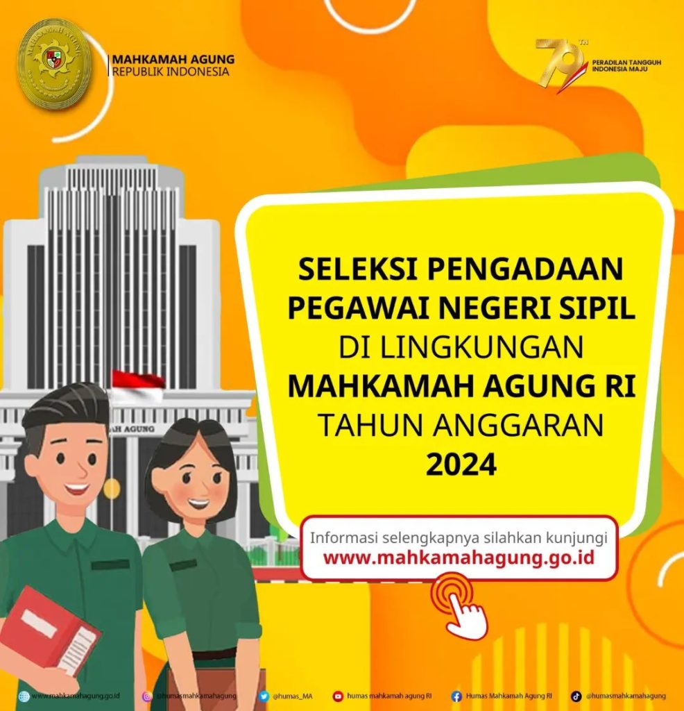 Sobat MA, Seleksi Pengadaan Pegawai Negeri Sipil di Lingkungan Mahkamah Agung RI Tahun Anggaran 2024 telah dibuka.