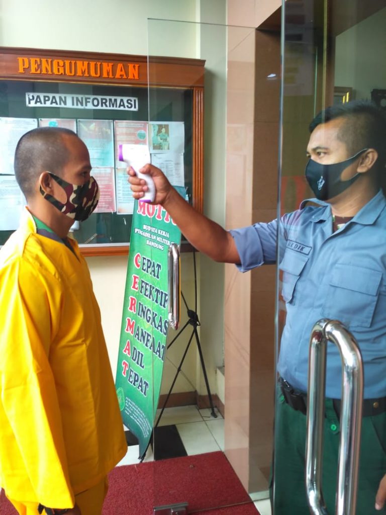 - Pengecekan suhu badan untuk pegawai dan pengunjung Pengadilan Militer II-09 Bandung.